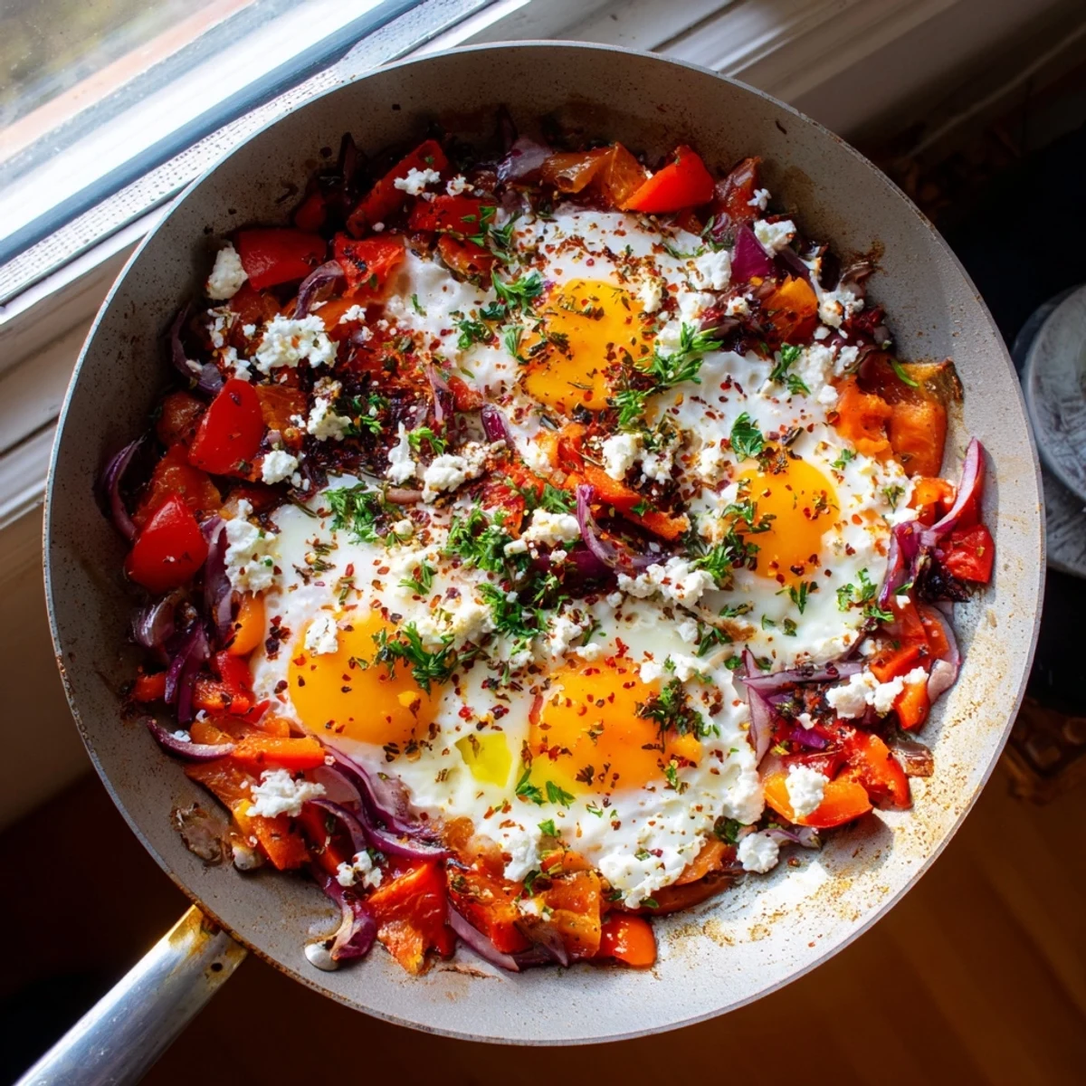This Mediterranean-inspired dish transforms simple ingredients into a memorable breakfast. Feta cheese cubes create a creamy, salty base that perfectly complements baked eggs with runny yolks. The combination of sautéed vegetables—tomatoes, red bell peppers, and onions—adds sweetness and depth, while garlic and oregano bring classic Greek flavors to the table.