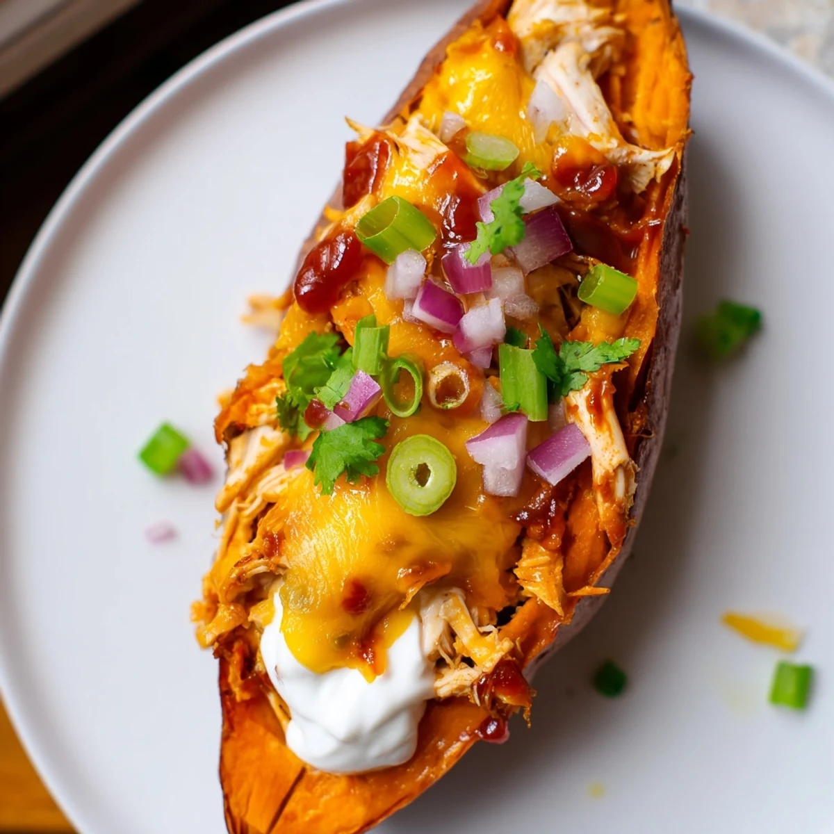 These BBQ chicken stuffed sweet potatoes combine tender roasted potatoes with smoky, saucy chicken and melted cheddar. The natural sweetness of the potatoes balances perfectly with the tangy barbecue flavor, while fresh green onions and herbs add brightness and crunch. Each serving delivers protein, fiber, and rich comfort in one wholesome package.