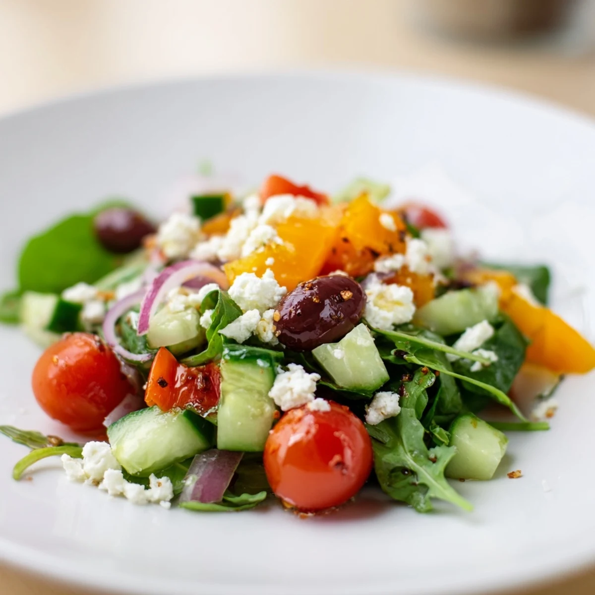 This fresh salad combines halved cherry tomatoes, diced cucumber and red bell pepper, thinly sliced red onion and a mix of arugula, spinach and romaine. Whisk extra-virgin olive oil, fresh lemon juice, Dijon and a touch of honey into an emulsified dressing, toss gently to coat, and serve immediately for best texture. Add grilled chicken or chickpeas for protein, or omit cheese for a dairy-free option.