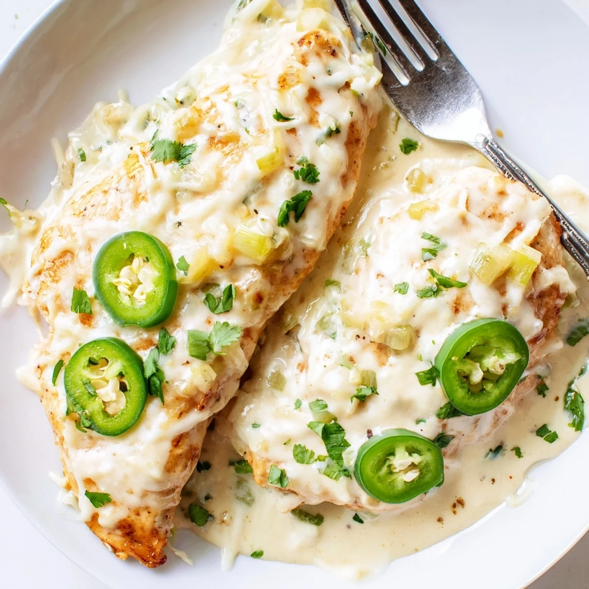 This skillet dish features golden chicken breasts paired with a velvety sauce made from fresh jalapeños, heavy cream, and Monterey Jack cheese. The seasonings of paprika and cumin add depth, while sautéed onions and garlic build a flavorful foundation. Perfect for those who enjoy moderate heat with their creamy comfort food.