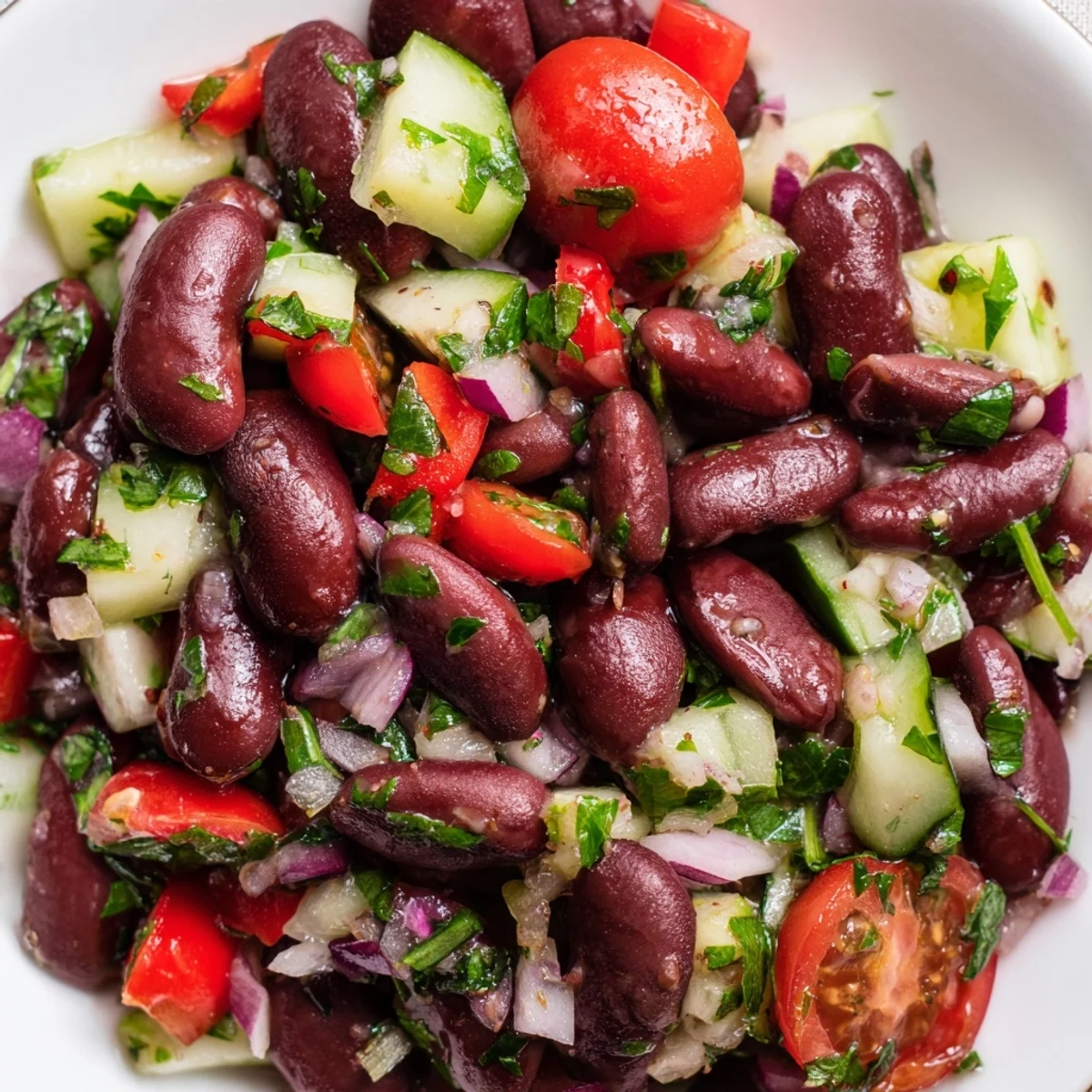 This refreshing kidney bean salad combines protein-rich legumes with crisp red onion, bell pepper, cucumber, and cherry tomatoes. The tangy vinaigrette, made with olive oil, red wine vinegar, and Dijon mustard, ties everything together beautifully. Ready in just 15 minutes with no cooking required, this versatile dish works perfectly as a satisfying lunch or a colorful side for grilled meats and sandwiches.