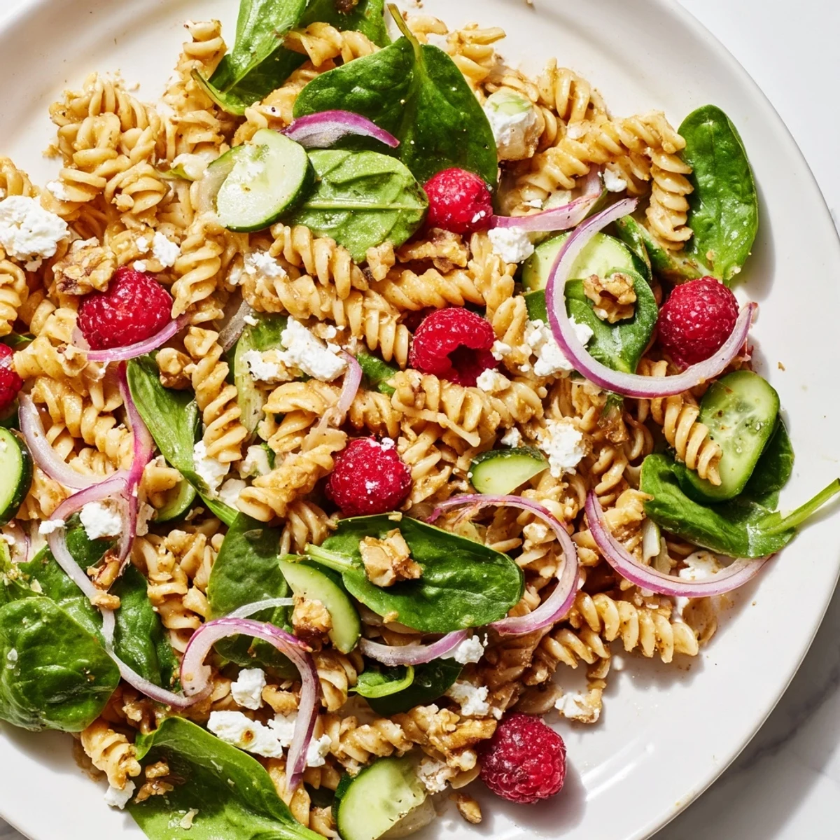 - Toss cooled pasta with spinach, red onion, cucumber, and half the raspberries in a large bowl
